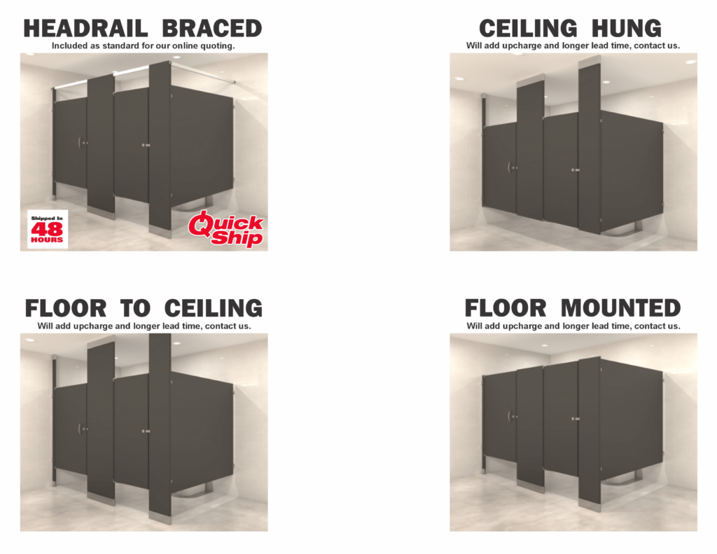If you would like a quote, please email your material of choice, restroom drawings or pics, and ship to zip code to sales@discountstalls.com or call 844-827-1208