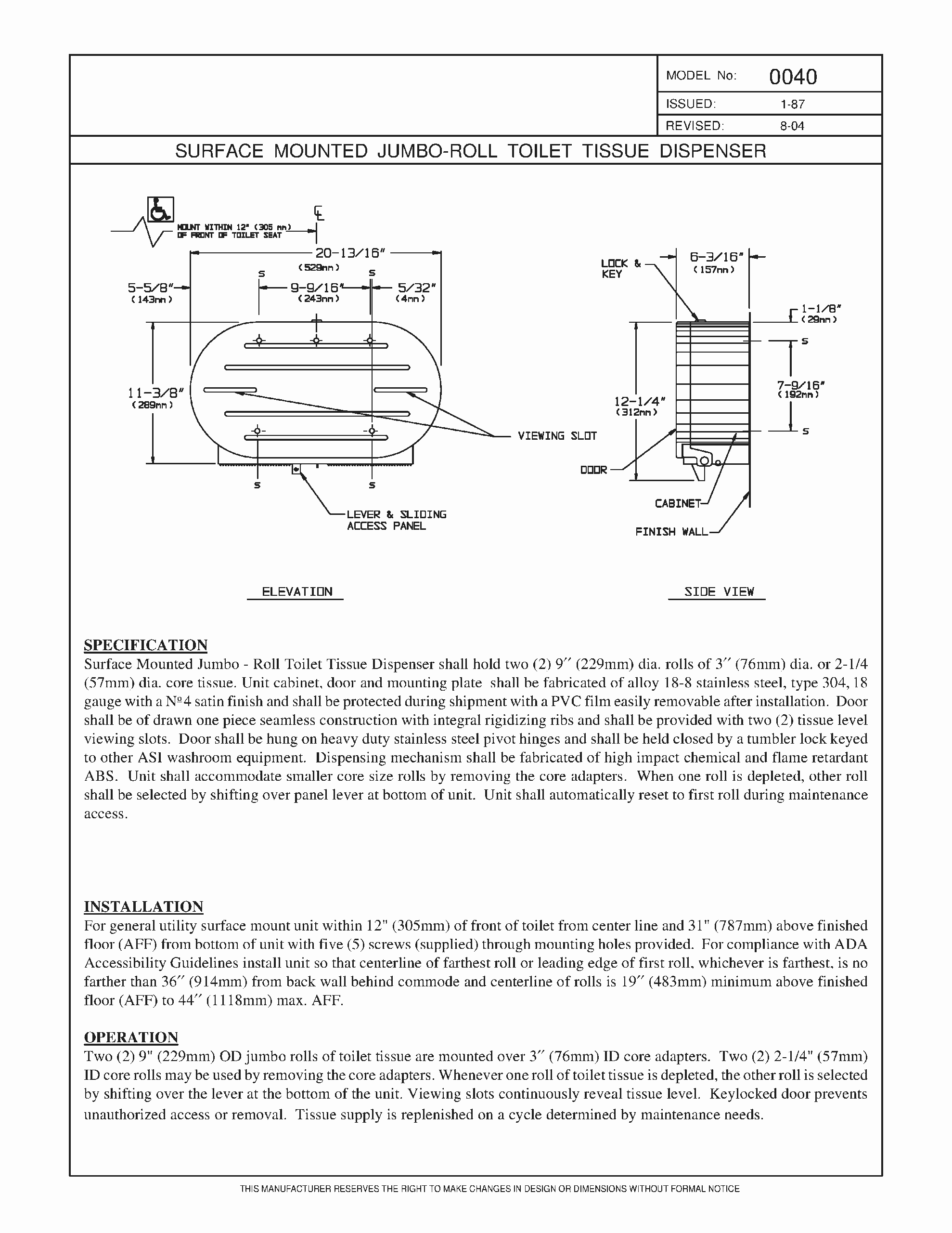 Surface Mounted Jumbo – Roll Toilet Tissue Dispenser shall hold two 9 ′′ diameter rolls of 3 ′′ diameter or 2-1/4 diameter core tissue. Unit cabinet, door and mounting plate shall be fabricated of alloy 18-8 stainless steel, type 304, 18 gauge with a #4 satin finish and shall be protected during shipment with a PVC film easily removable after installation. Door shall be of drawn one piece seamless construction with integral rigidizing ribs and shall be provided with two (2) tissue level viewing slots. Door shall be hung on heavy duty stainless steel pivot hinges and shall be held closed by a tumbler lock keyed to other ASI washroom equipment. Dispensing mechanism shall be fabricated of high impact chemical and flame retardant ABS. Unit shall accommodate smaller core size rolls by removing the core adapters. When one roll is depleted, other roll shall be selected by shifting over panel lever at bottom of unit. Unit shall automatically reset to first roll during maintenance access.
