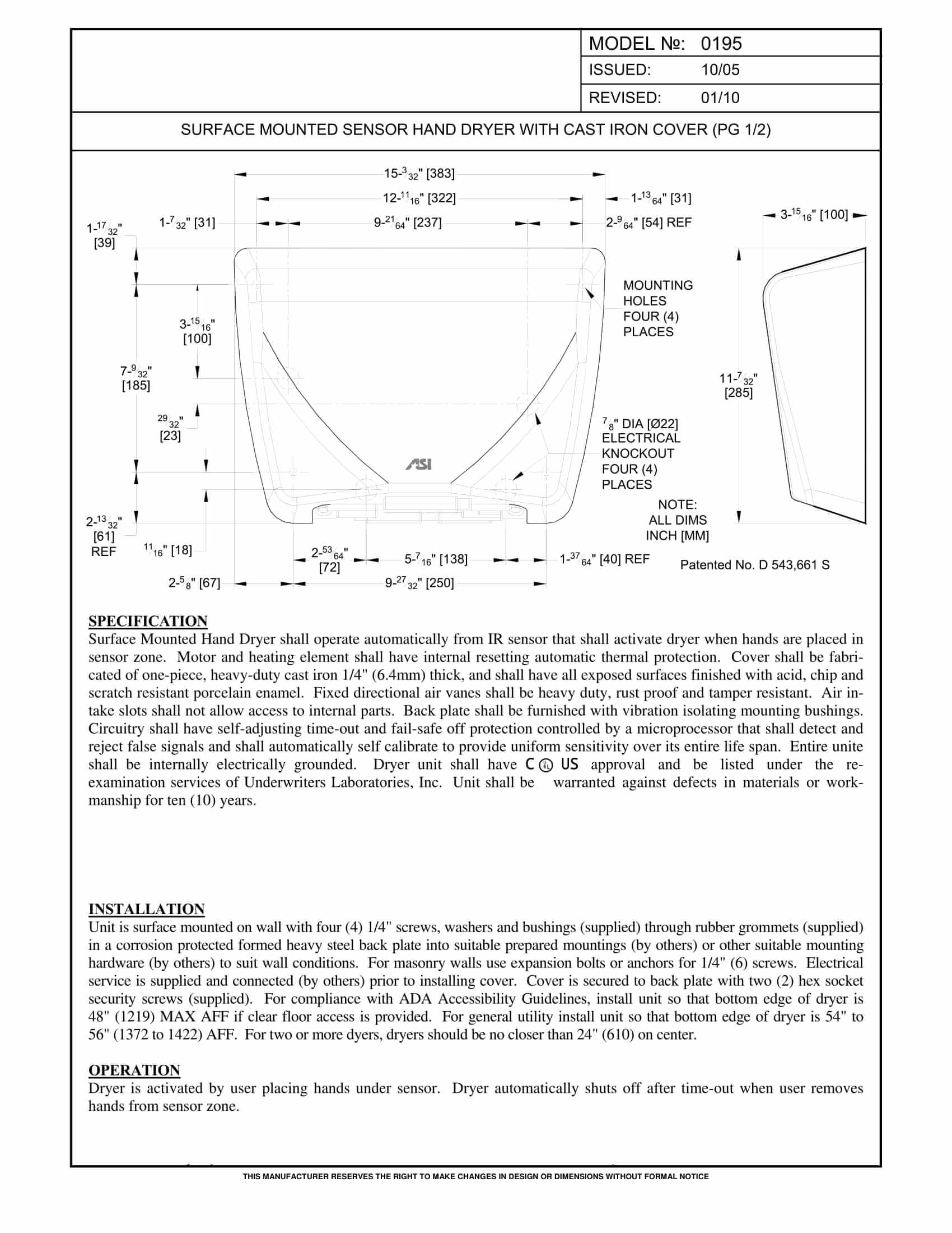 - Surface Mounted Hand Dryer shall operate automatically from IR sensor that shall activate dryer when hands are placed in sensor zone.