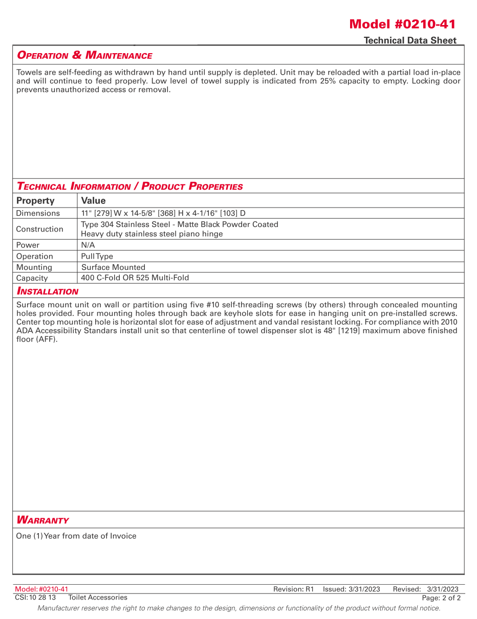 - ASI 0210-41 | Bobrick B-262 | Bradley 250-15