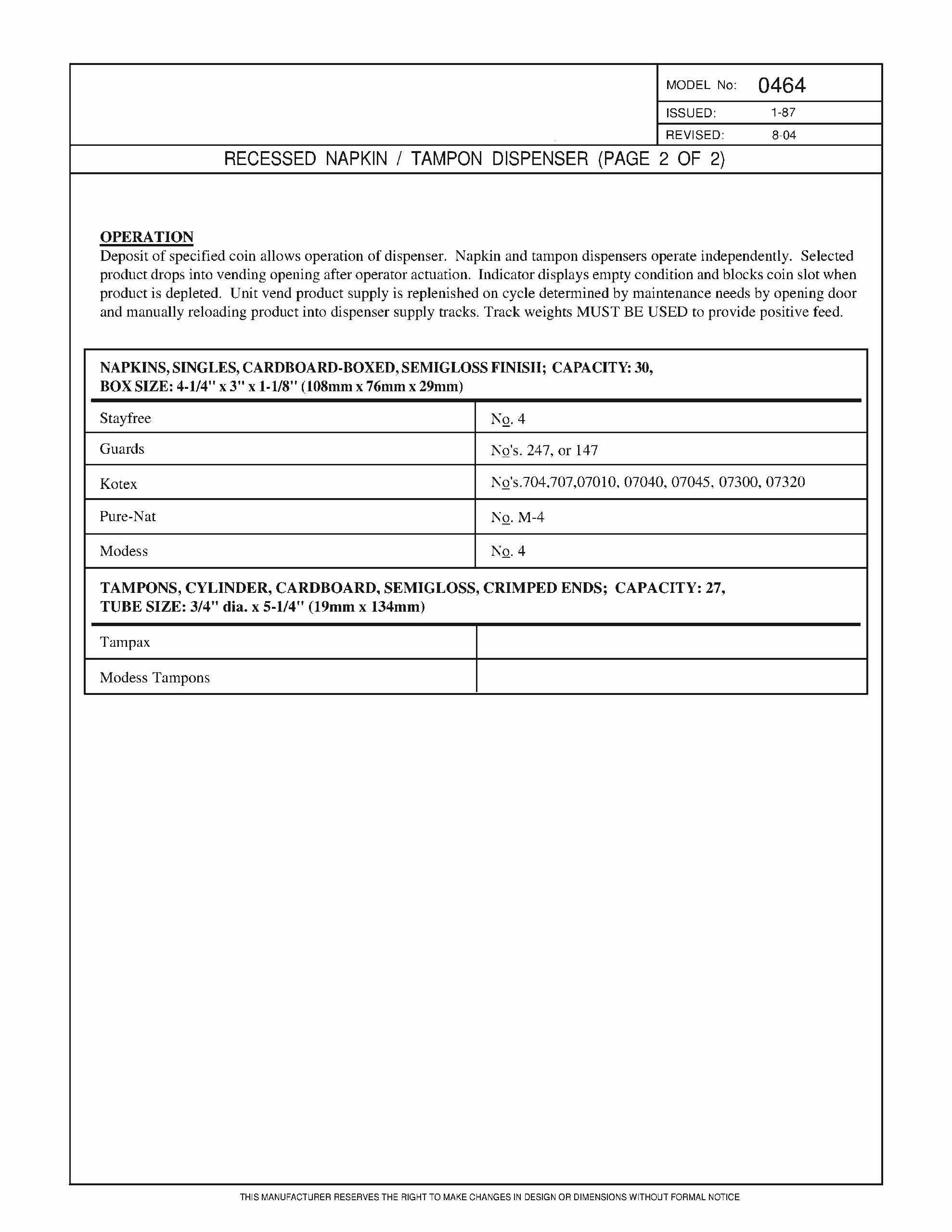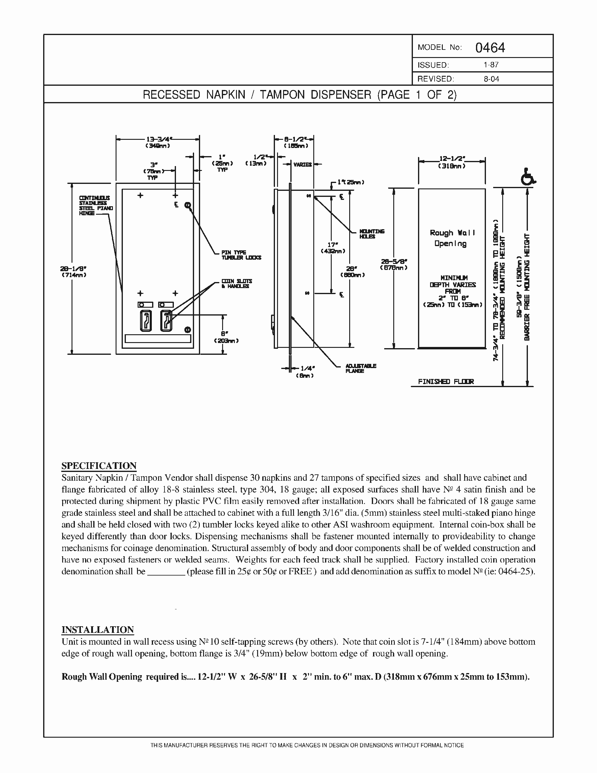 - Semi-Recessed Mounted Dual Sanitary Napkin & Tampon Dispenser shall hold 30 napkins and 27 tampons of specified sizes.
