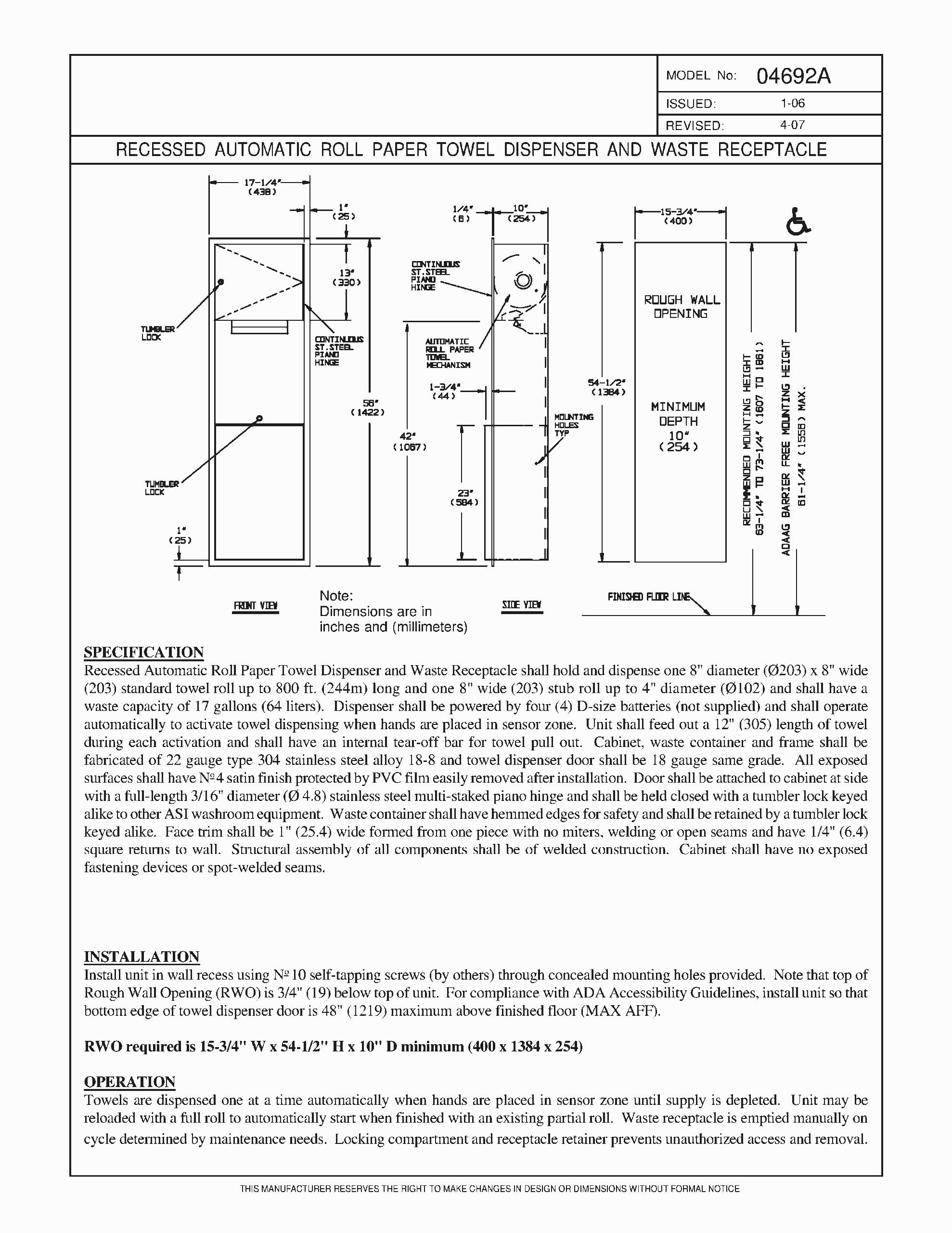 • Recessed Automatic Roll Paper Towel Dispenser and Waste Receptacle.