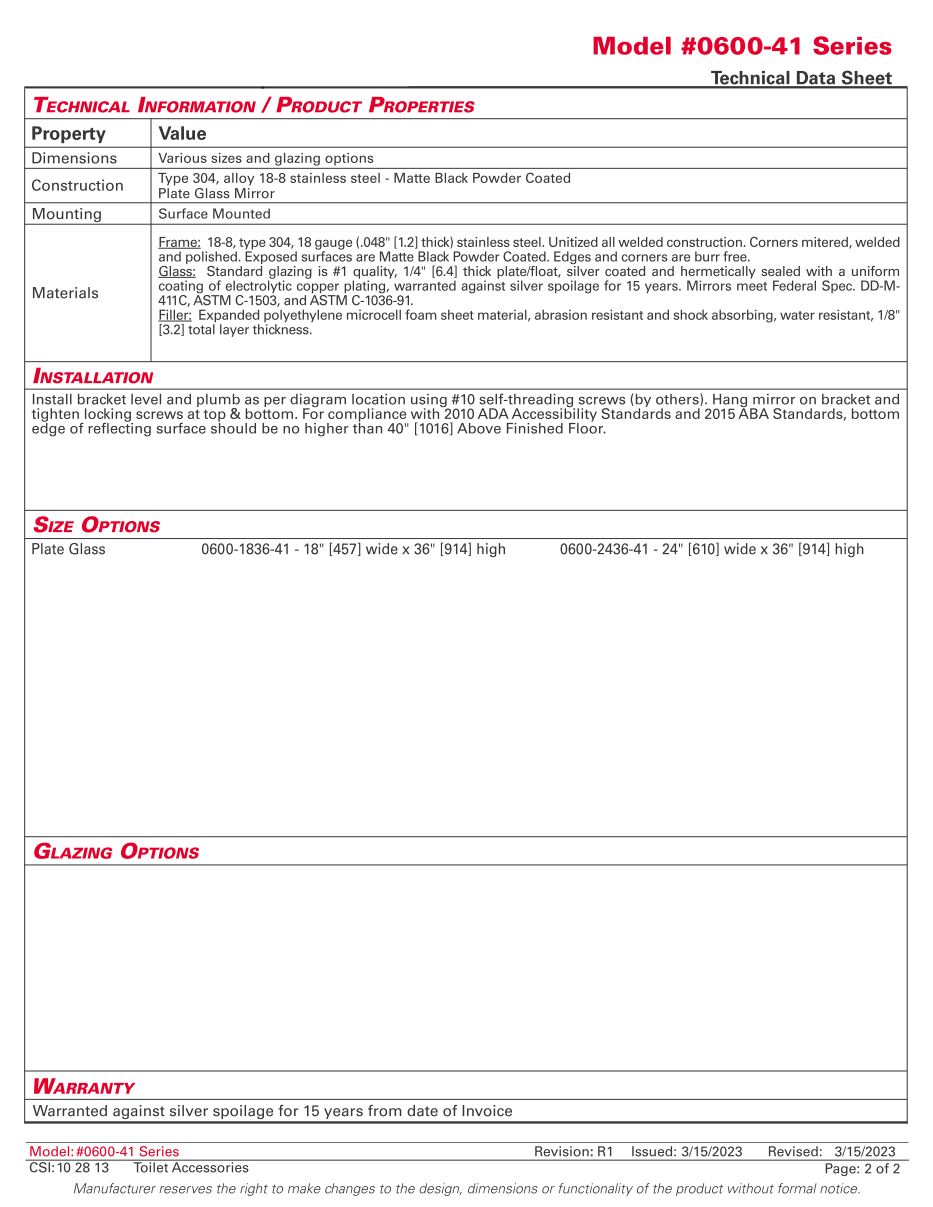 - Mirror glazing shall be warranted for 15 years against silver spoilage.