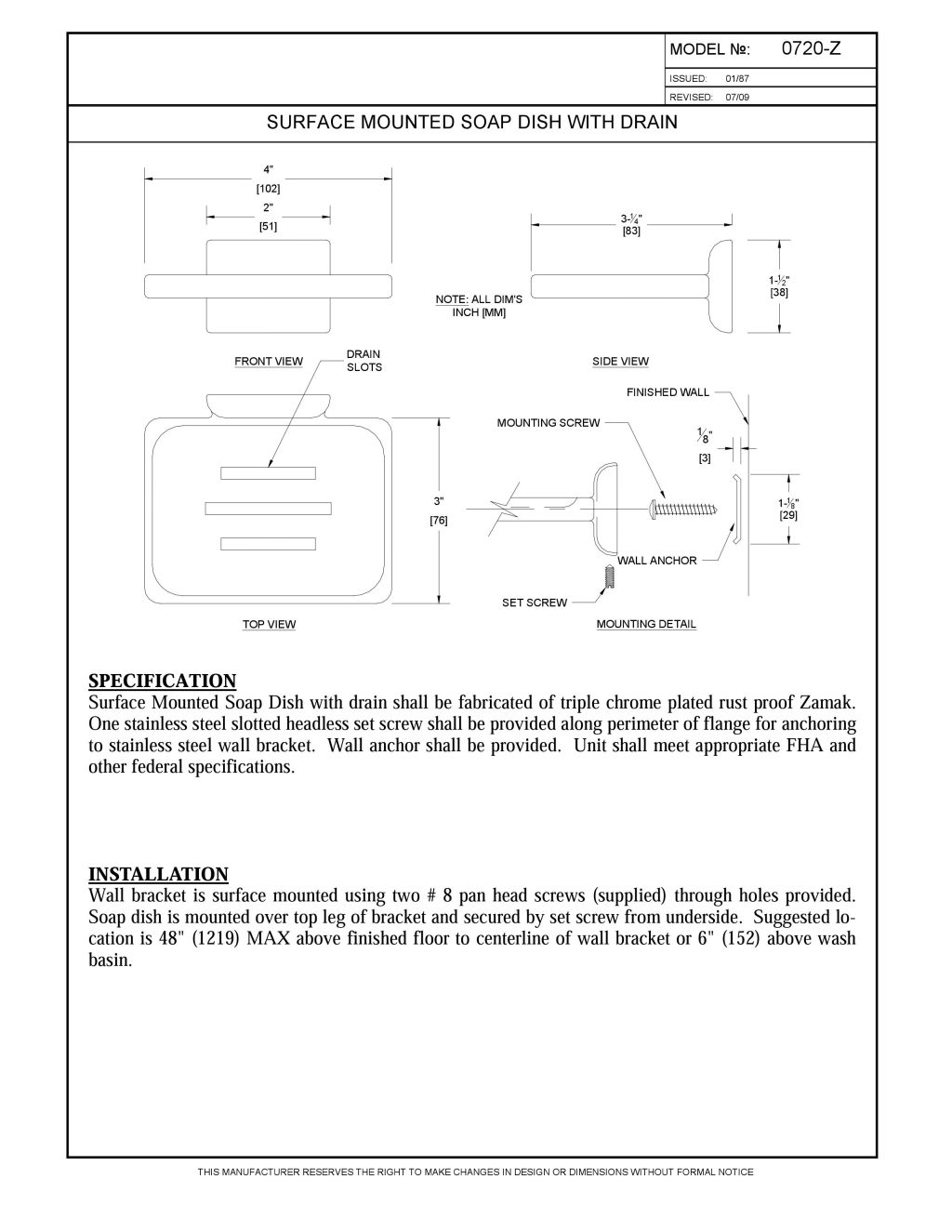 Surface Mounted Soap Dish shall be fabricated of triple chrome plated rust proof Zamak. One stainless steel slotted headless set screw shall be provided along perimeter of flange for anchoring to