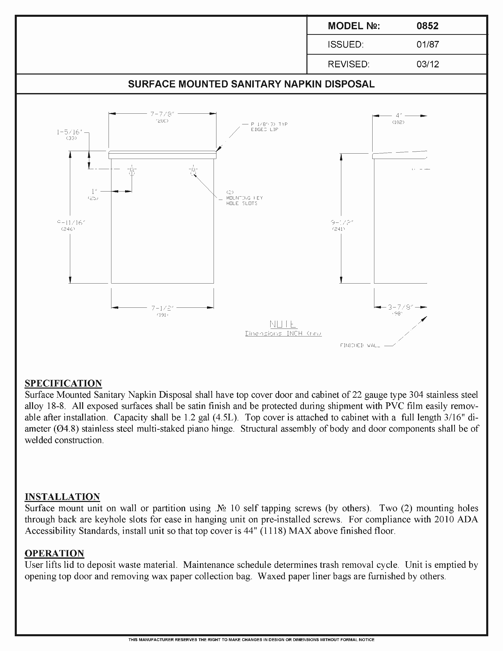• Surface Mounted Sanitary Napkin Disposal shall have top cover door and cabinet of 22 gauge type 304 stainless steel alloy 18-8.