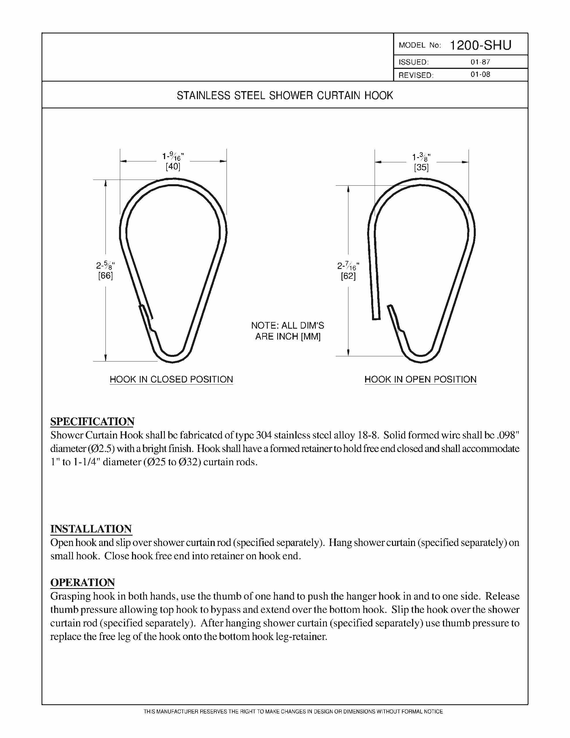 • Shower Curtain Hook shall be fabricated of type 304 stainless steel alloy 18-8.