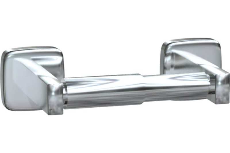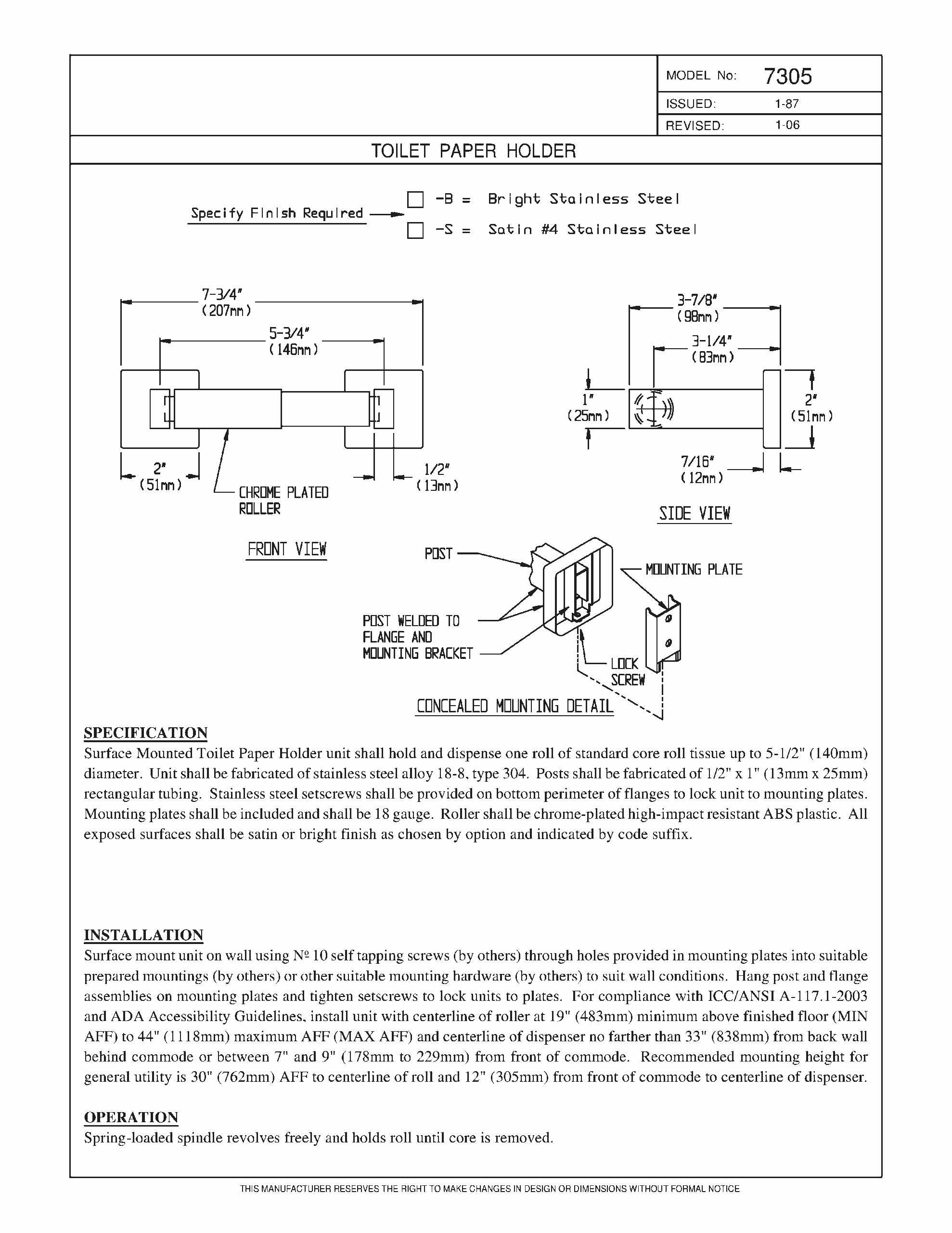 Surface Mounted Toilet Paper Holder unit shall hold and dispense one roll of standard core roll tissue up to 5-1/2″ diameter. Unit shall be fabricated of stainless steel alloy 18-8, type 304. Posts shall be fabricated of 1/2″ x 1″ rectangular tubing. Stainless steel setscrews shall be provided on bottom perimeter of flanges to lock unit to mounting plates. Mounting plates shall be included and shall be 18 gauge. Roller shall be chrome-plated high impact resistant ABS plastic. All exposed surfaces shall be satin or bright finish as chosen by option and indicated by code suffix.