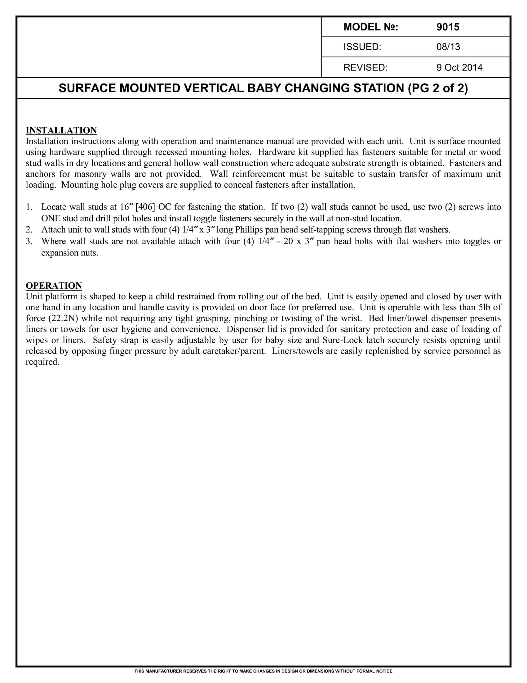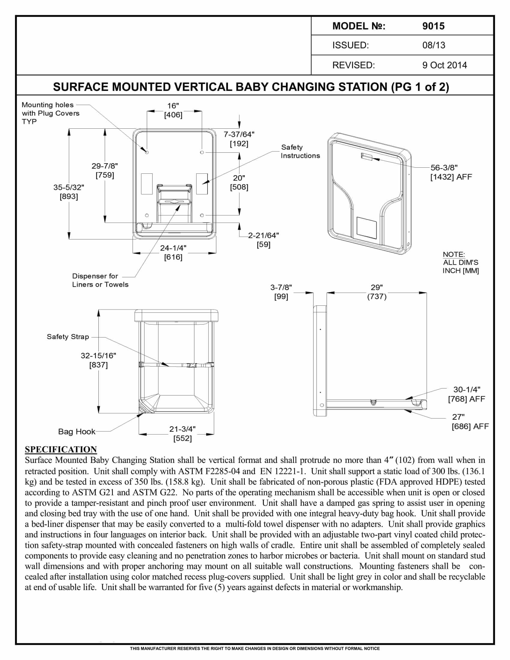 The ASI 9015 by American Specialties is a surface mounted vertical baby changing station offering an affordable and convenient solution for restrooms to provide a baby changing station. American Specialties 9015 is fabricated of of FDA approved fungus and bacteria resistant solid plastic and shall support a static load of 50 pounds. This horizontal unit has a pull handle and concealed damped gas spring, assisting in easy one-handed operation. It is fabricated of FDA-approved fungus- and bacteria-resistant solid plastic. Unit shall comply with 2010 ADA Accessibility Standards. The ASI 9015 two-part, vinyl-coated, adjustable safety strap assures child protection. Bag hooks, built-in bed liner and multi-lingual instructions add convenience.