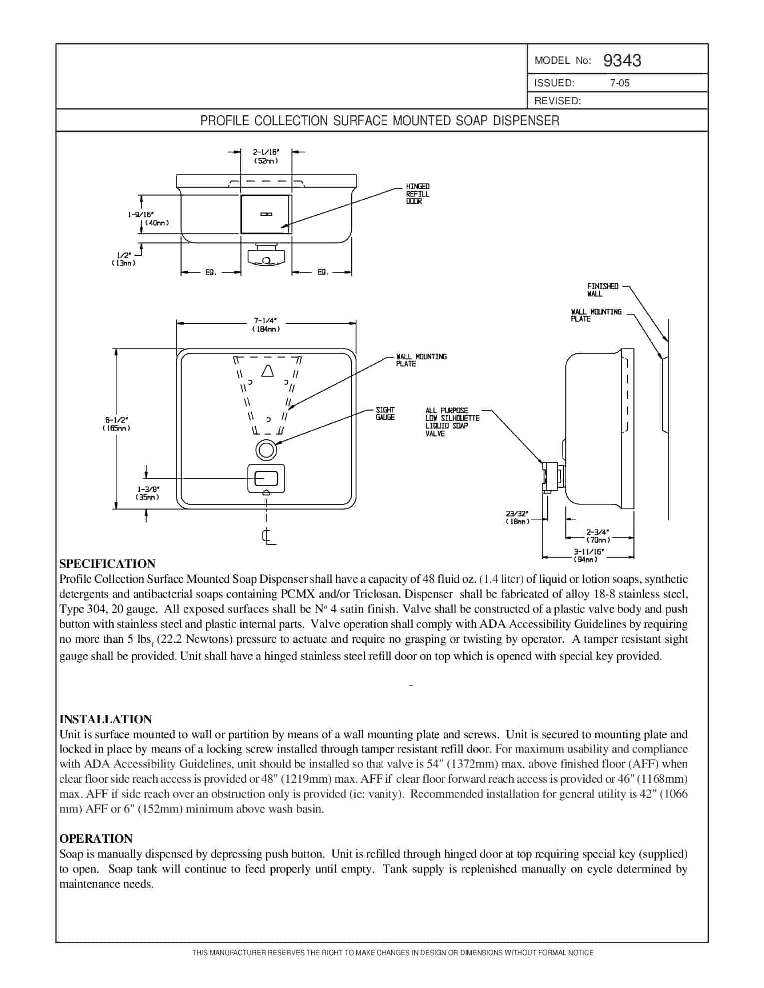 Profile Collection Surface Mounted Soap Dispenser shall have a capacity of 48 fluid oz. (1.4 liter) of liquid or lotion soaps, synthetic detergents and antibacterial soaps containing PCMX and/or Triclosan. Dispenser shall be fabricated of alloy 18-8 stainless steel, Type 304, 20 gauge. All exposed surfaces shall be N o 4 satin finish. Valve shall be constructed of a plastic valve body and push button with stainless steel and plastic internal parts. Valve operation shall comply with ADA Accessibility Guidelines by requiring no more than 5 lbs pressure to actuate and require no grasping or twisting by operator. A tamper resistant sight gauge shall be provided. Unit shall have a hinged stainless steel refill door on top which is opened with special key provided.