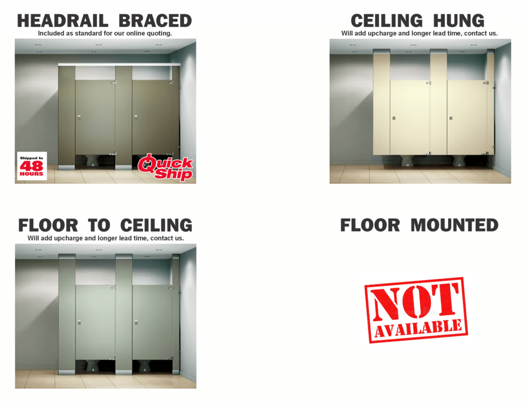 If you would like a quote, please email your material of choice, restroom drawings or pics, and ship to zip code to sales@discountstalls.com or call 844-827-1208